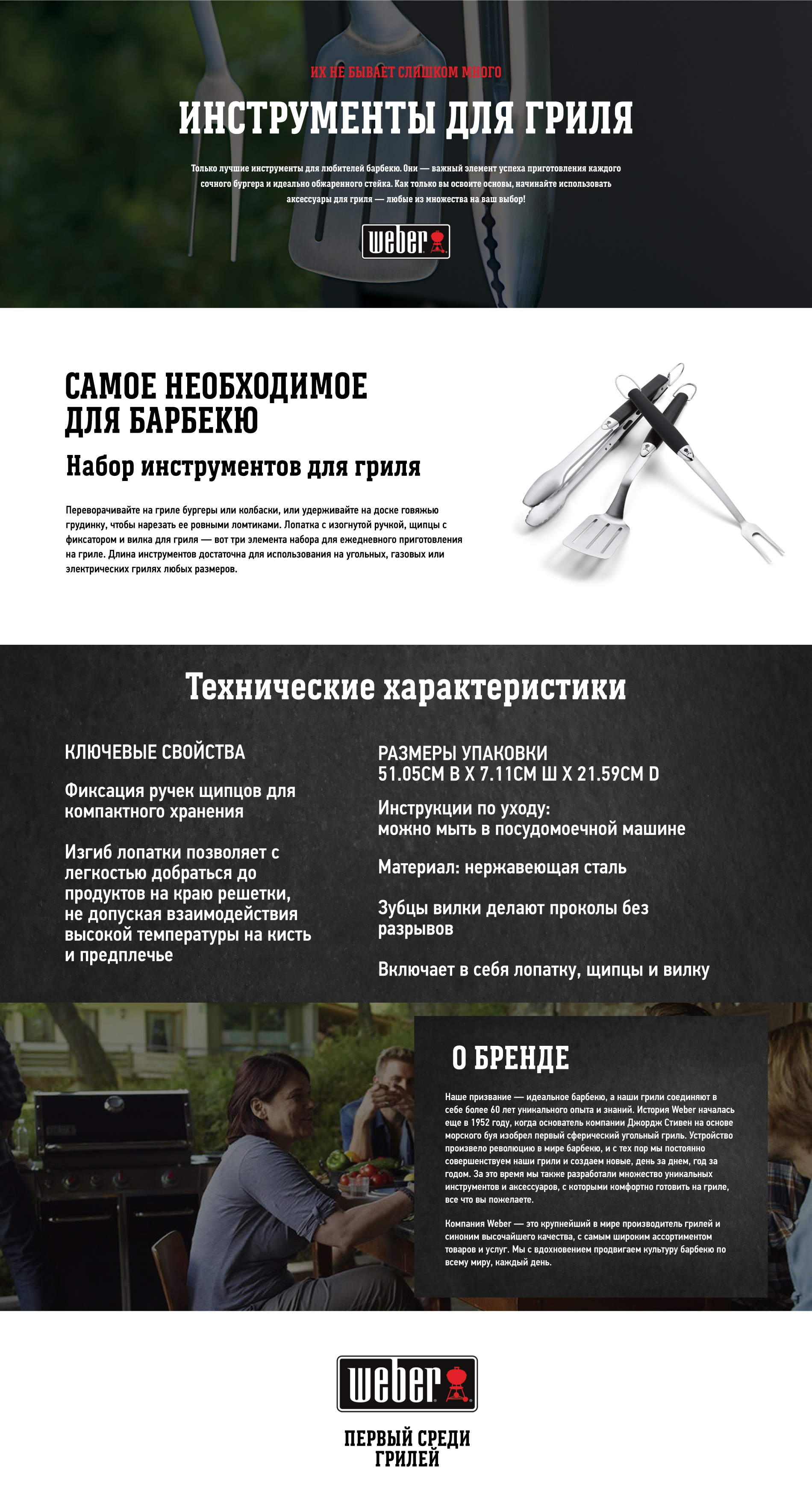Набор из 3-х приборов Weber — это ваш надежный компаньон для любых кулинарных приключений на гриле, сочетающий в себе функциональность, безопасность и фирменное качество Weber!
