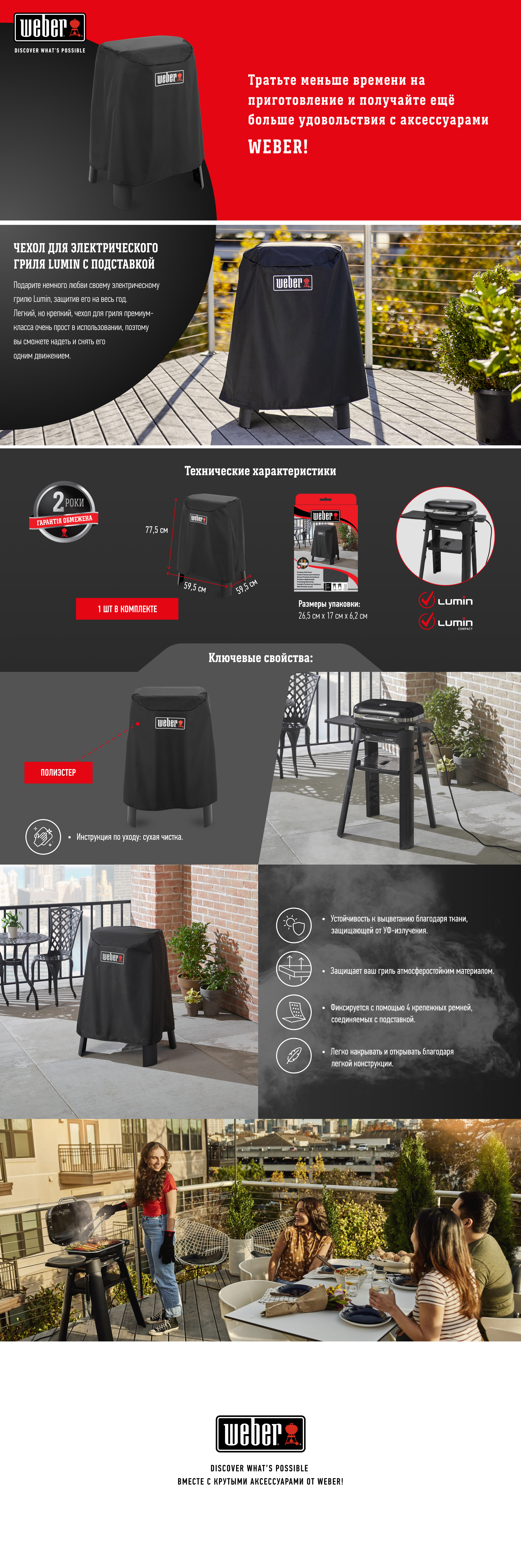 Чехол для электрического гриля Weber Lumin с подставкой — это незаменимый аксессуар для обеспечения максимальной защиты и поддержания безупречного состояния вашего инновационного гриля на фирменной подставке!